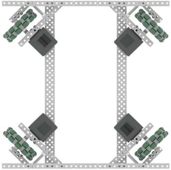 NOTE: When building an X-Drive, it is best to position the wheels in a square shape (i.e. the vertical distance between wheel centers is equal to the horizontal distance between wheel centers). Although other configurations will work, arranging the wheels in a square creates the optimal maneuverability and turning.