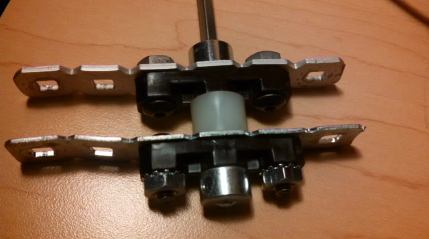 Assembly: This joint is assembled by first securing one bearing to each component. Then, the axle is fed through both bearings, with a spacer in between, and secured using a shaft collar at either end.