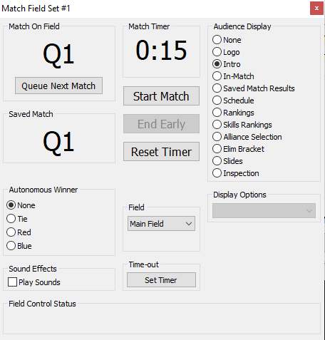 The first things to notice are the Match On Field (with option to Queue Next Match), and Match Timer. The main inputs in this display are Field (auto populated based on schedule), Audience Display (Automatically Intro when a match is queued, and swithces to In-Match when the match is started), Autonomous Winner (Displays during match but is finalized in scoring), and most importantly Start Match, End Early, Reset Timer (Abort Match is shown once a match is started).